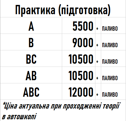 Детальну інформацію щодо послуг автошколи та цін можна отримати за адресами: м.Суми, вул. Іллінська, 56, або вул. Харківська, 2/2 (ТРЦ “Мануфактура”, 1 поверх), а також за тел.: 0950042181, 0934442181.